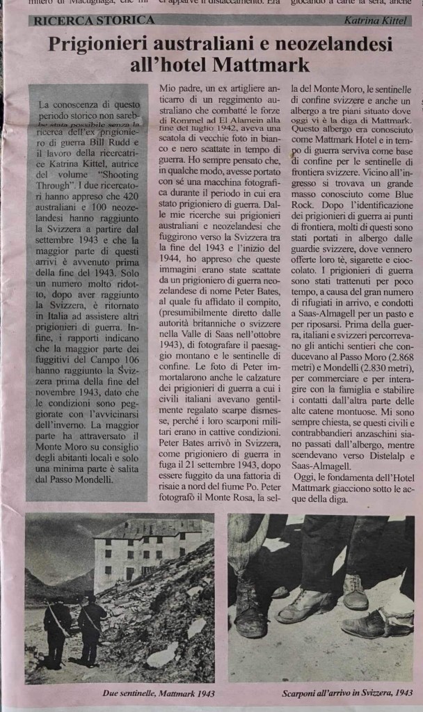 News 2023 -In the July-December 2023 issue of a newspaper of northern Italy’s Macugnaga and the Anzasca Valley, my article was published about Australian and New Zealand POWs arriving to Switzerland and receiving their first taste of Swiss hospitality (tea, cigarettes, hot soup) at Hotel Mattmark (Saas Valley). The hotel was used during wartime as a base for Swiss border guards. It was submerged postwar under the Mattmark Dam. Visitors can walk the perimeter of the dam and if feeling more adventurous, climb up towards Monte Moro!